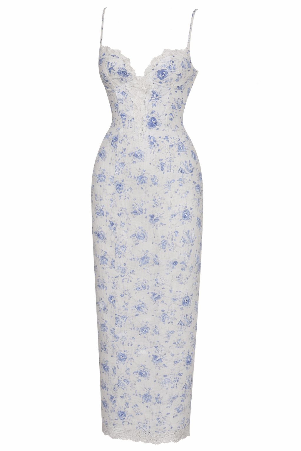 The soft blue floral print on a pristine white base evokes timeless romance think garden weddings, sunset dinners, and unforgettable entrances. Adjustable spaghetti straps allow for the perfect fit, while the flowing silhouette elongates the body for an effortlessly graceful look.